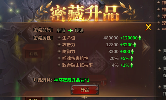 (1)多个密藏降世,每个密藏中可镶嵌一种耀世级宝物,获得高额属性加成,还可获得神圣破击率、涅槃破击率、噬魂破击率等稀有属性!