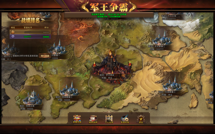 2、活动内,每个军团将有1个主城及2个要塞城池,以及中立地图罗兰峡谷