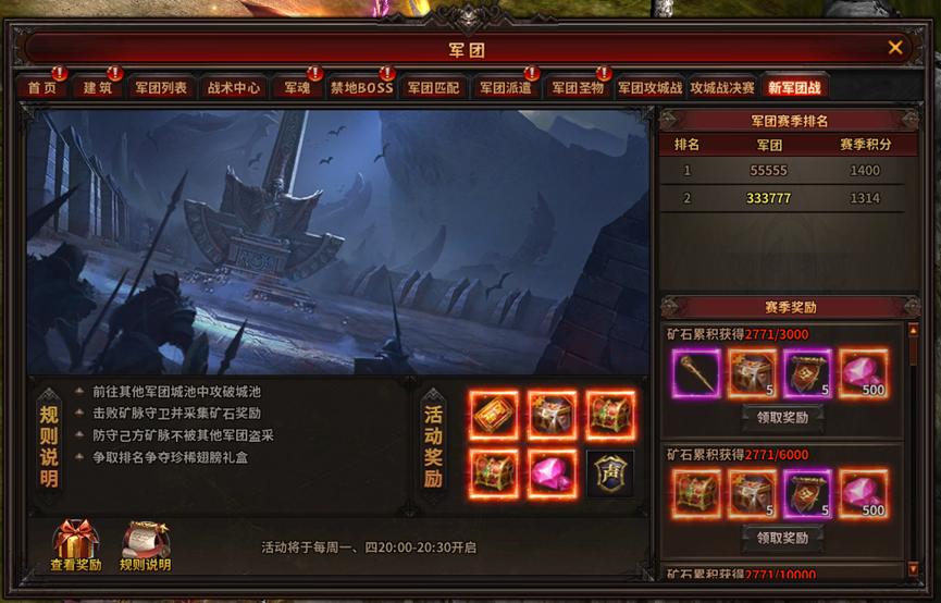 5、每次活动结束后将根据成绩增加、减少各军团的排名积分,每个军团赛季结束后,将根据同组内各军团排名积分分发赛季奖励!