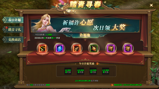 踏青寻春活动共包含【春日许愿】、【踏青寻礼】、【兑换商店】两个部分