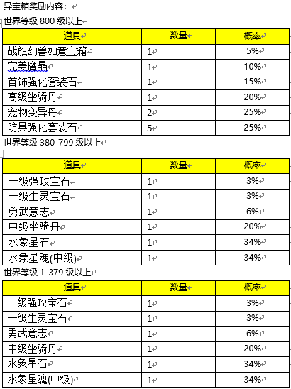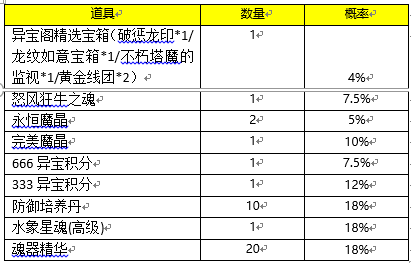 获得异宝箱奖励,开启有机会获得各种奖励;