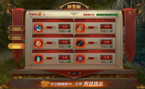 玩家在异宝探秘中可以获得异宝积分,异宝积分可以在异宝兑换中兑换商品,部分异宝限量出售,走过路过前往不要错过哦!
