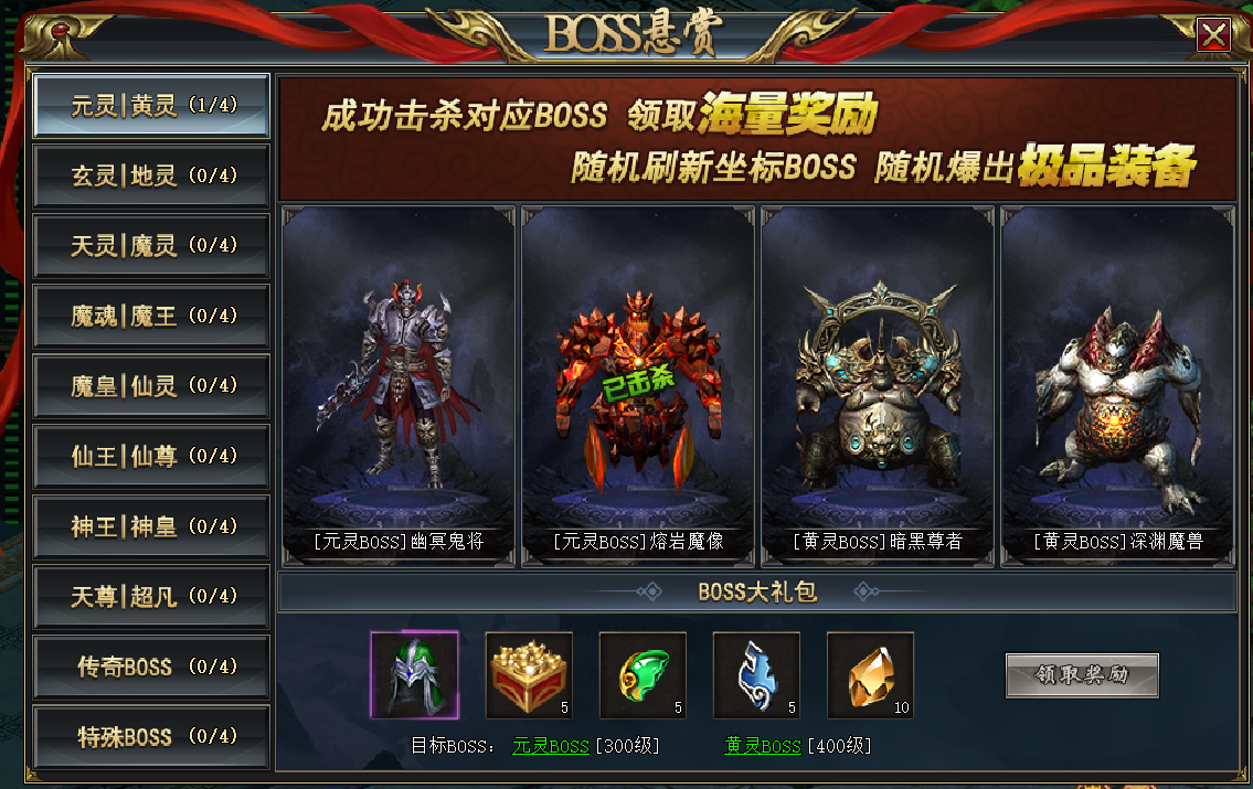 击杀对应条件的BOSS,完成对应条件,即可领取豪礼