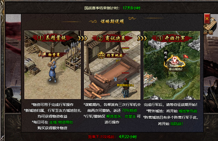 ①各帮派龙头、总堂主可在谋略期完成行军操作,行军将消耗帮派物资