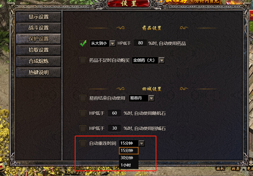 二、新增页游端离线后可自动重连的功能。玩家在手游端登陆后,页游端会在超过设置时间后自动重连,且在当前地图恢复成挂机状态。