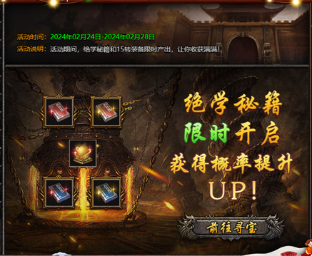 活动说明:活动期间探宝几率提升,绝学秘籍获得概率提升。