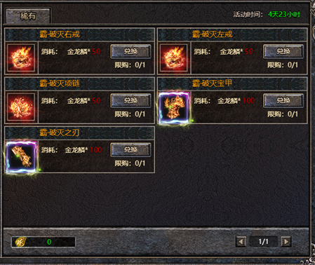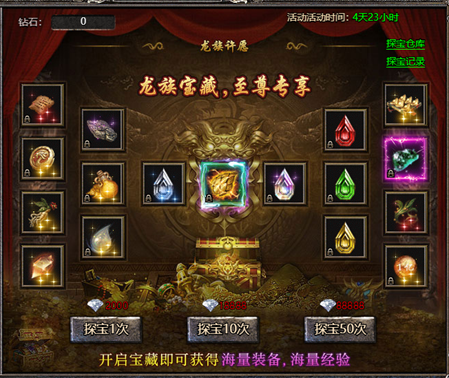 活动说明:活动期间将开启限定寻宝,玩家可以通过探宝获得奖池中的奖励,奖池中的金龙鳞可以兑换霸王装备!!