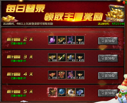 活动说明:活动期间,4转以上玩家累计登录即可领取奖励。