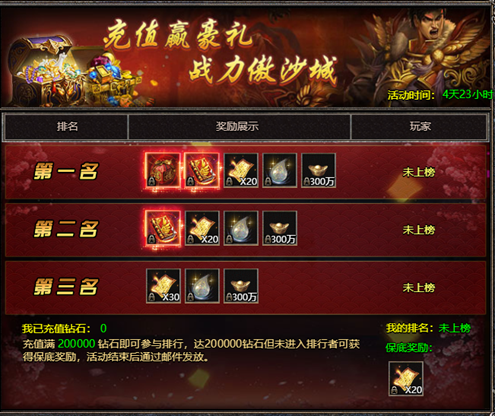活动说明:活动期间玩家累计充值达到指金额即可进入排行榜,活动结束时根据排名获得相应的奖励。