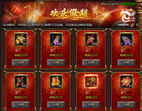活动说明:活动期间击杀指定等级野外BOSS即可获得节日道具,兑换稀有奖励。