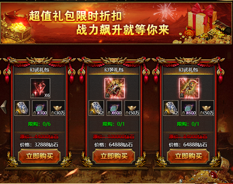 活动说明:活动期间将上架限购礼包,同时将会返场限定时装幻武---“金玉满堂”