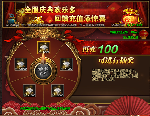 活动说明:活动期间每日充值达到条件可免费抽取大量钻石奖励,每日抽取次数清零,请及时使用。