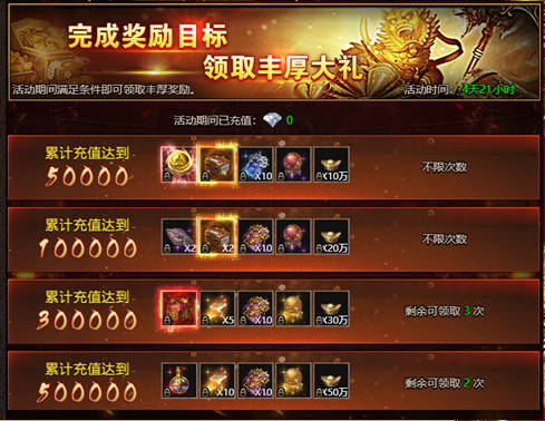 活动说明:活动期间累计充值达到条件即可领取丰厚奖励,次数有限先到先得。