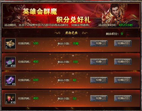 活动说明:活动期间击杀指定等级野外BOSS即可获得活动积分,兑换实用道具。