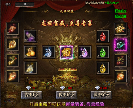 活动说明:活动期间开放龙卫宝藏,通过探宝可获得大量稀有道具和龙鳞道具。