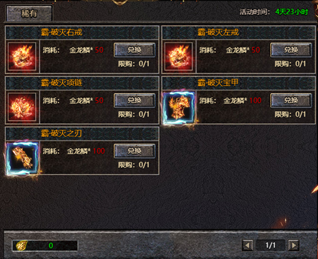 活动说明:活动期间可使用在龙族宝藏中获得的金龙鳞兑换强力的霸王装备。