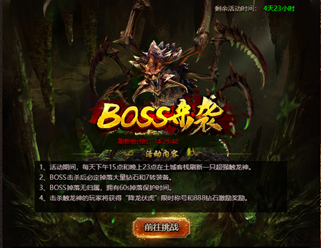活动说明:活动期间触龙神将会出现袭扰世间,前往击杀将会掉落丰厚奖励。