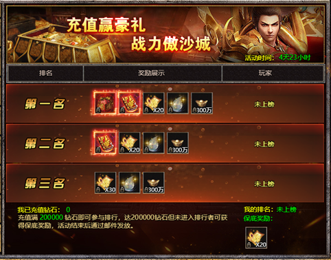 活动说明:活动期间玩家累计充值达到指金额即可进入排行榜,活动结束时根据排名获得相应的奖励。