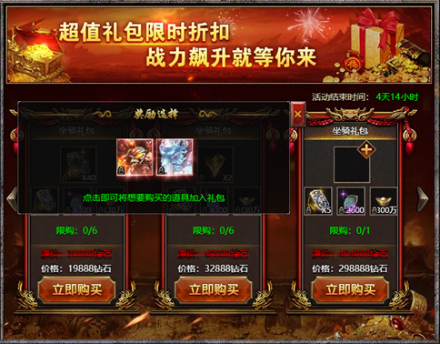 活动说明:活动期间玩家可优惠购买道具,还将获得额外超值奖励。