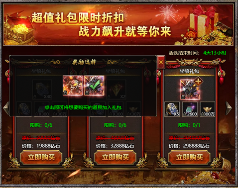 活动说明:活动期间玩家可优惠购买道具,还将获得额外超值奖励。