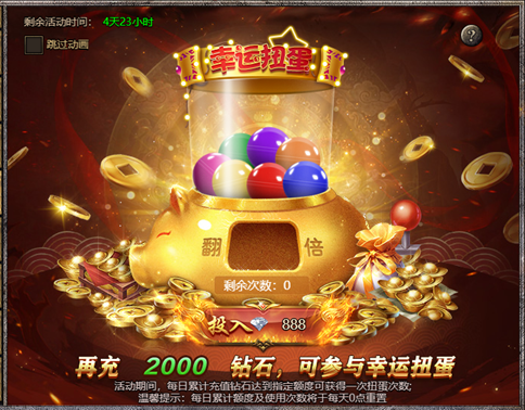 活动说明:活动期间玩家每日充值到达指定金额即可获得一次幸运扭蛋使用次数,消耗使用次数以及一定数量钻石将获得扭蛋倍率*消耗钻石数量的绑定钻石返利。