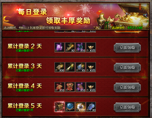 活动说明:活动期间,4转以上玩家累计登录即可领取奖励。