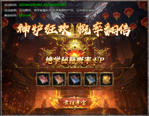 活动说明:活动期间探宝几率提升,绝学秘籍获得概率提升。