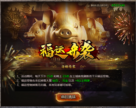 活动说明:活动期间每天指定时间将会在土城客栈刷新若干只福运怪物,击杀可获得大量奖励。
