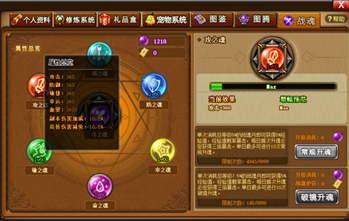 4、升魂分为常规升魂和破境升魂,常规升魂每次消耗5%经验值数量的战魂丹,提供5%经验值,概率产生暴击,每日首次常规升魂必定3倍暴击。破境升魂需要消耗1.5倍的战魂丹,以及每次破境升魂均需要消耗1张护魂符。提供5%经验值,概率产生暴击,每日首次破镜升魂必定3倍暴击。