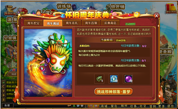 1、周年挖宝:玩家每日免费获得一次挖宝次数,每日商城消费达到500点券可以额外获得一次。每次挖宝会从普通奖励和稀有奖励中随机一份,连续四次未获得稀有奖励则下次必定是稀有奖励。获得28份挖宝奖励后会额外获得一份周年专属大礼;