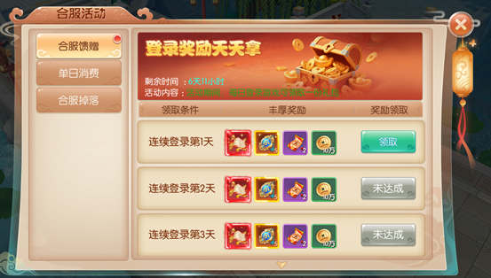 【活动内容】:合服后的前七天,玩家每天登陆都可以领取丰厚的奖励