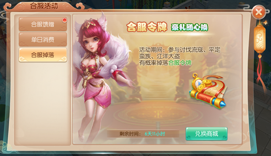【活动内容】:合服后第1-7天,南蛮、讨伐、大盗任务过程中有概率掉落合服令牌,可以在合服商店中兑换一些稀有道具。