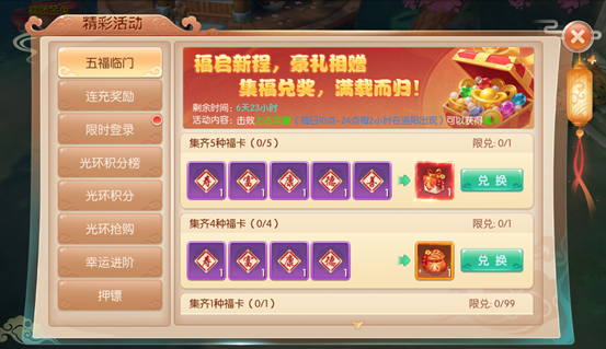 2.每次祈福消耗一张“祈福令”,并且可以获得一张福卡,可在五福降临中兑换奖励。