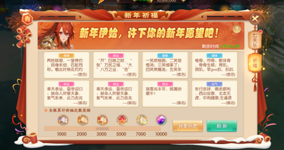 1.新的一年祈福求愿,全服务器祈福达到一定次数全服玩家都可领奖!