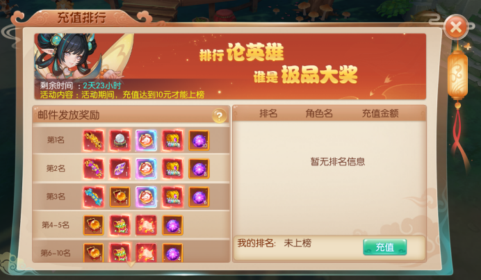 活动期间内玩家累计充值达到一定排名即可获得极品大奖,前三名可以获得龙之魂等和极品称号等奖励。