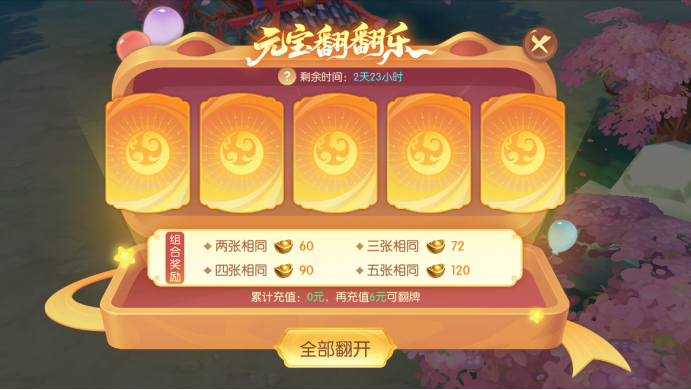 2.翻开全部5张卡牌后,根据牌面组合(任意组合、三张相同、四张相同、五张相同)获得元宝奖励。