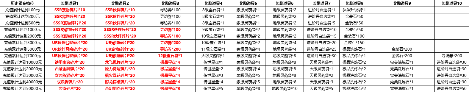 根据单角色再游戏内充值的总金额,可向客服申领对应档位奖励,每个档位终身限领1次