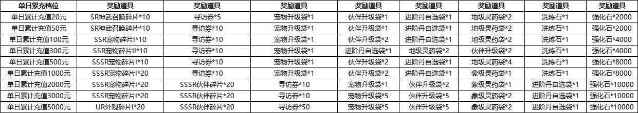 根据单角色单日游戏内充值,可向客服申领对应档位奖励,每个档位每日限领1次