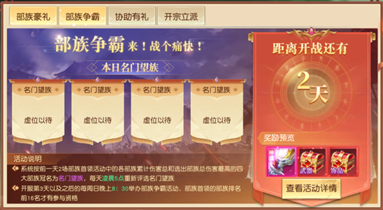 活动内容:开服第3天及之后每周日举办部落争霸活动,获得部落争霸胜利可以获得奖励。