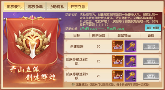 活动内容:活动时间内,创建部族即可领取一份豪礼,达到一定条件可领取更多豪礼。