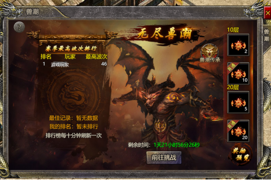 3、功能说明:进入兽潮后倒计时1分钟,击杀怪物奖励时间,倒计时结束记录波次,每周波次排名,波次达标可领取首通奖励、周常奖励,首通奖励不重置,周常奖励每周重置。