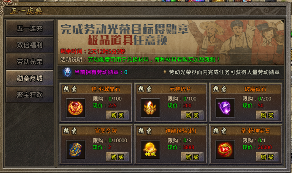 4.勋章商城:劳动光荣内获得的劳动勋章可在此兑换奖励,奖励道具按开服天数来展示,活动持续三天时间。