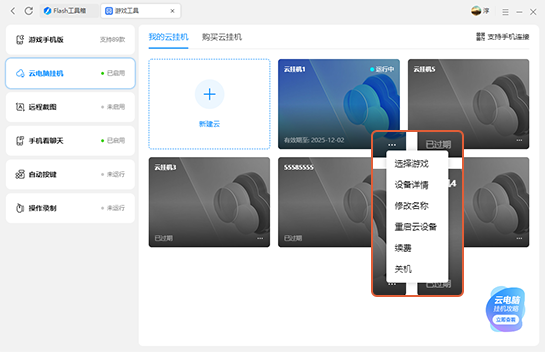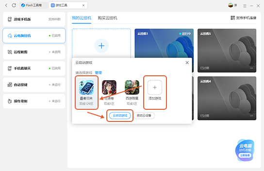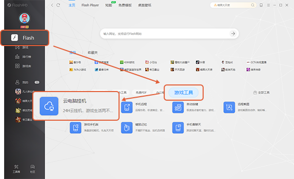打开Flash页面,切换到游戏工具,点击云电脑挂机
