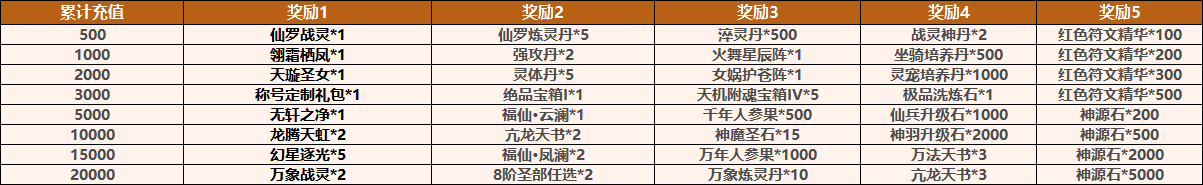 活动说明:活动期间,累计充值500元以上可以参与,活动时间内玩家充值每达到一个档次即可领取对应档次的奖励,一个档次只能申请一次。