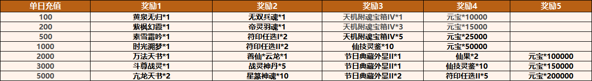 活动期间,单日充值100元以上可以参与,玩家单日充值达标对应档次,领取最高档次奖励,且只能申请一次。