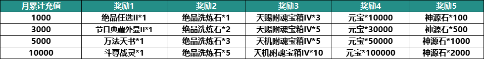 活动说明:活动期间,当月累计充值1000元以上可以参与,玩家当月累计充值每达到一个档次即可领取对应档次的奖励,一个档次只能申请一次。
