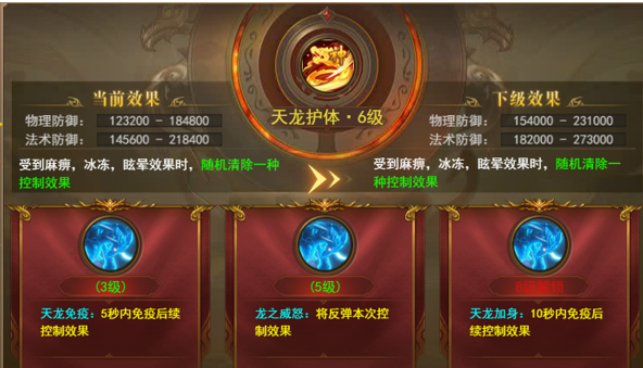 被动神技:天龙护体--受到麻痹、冰冻、眩晕效果时,随机清除一种负面效果,技能提升到3、5、8级还可以激活特殊效果