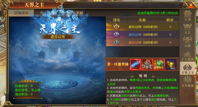 --排名第一玩家获得天界之主,区服第一的获得天界神兵称号,持续下一期结束