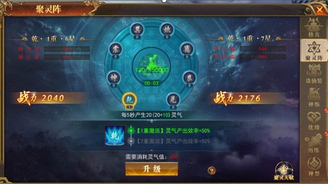 --开启天界即可激活聚灵阵,激活后无时无刻都在产生灵气,灵气需要及时消耗,达到贮存上限后不在增加灵气
