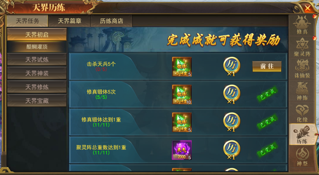 完成历练任务可领取奖励和历练点,历练点可在历练商城兑换珍贵道具